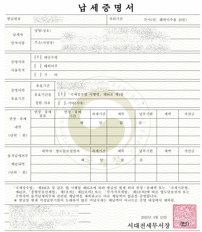 - 국세청 또는 지방자치단체에서 세금 체납 여부를 확인할 수 있습니다.